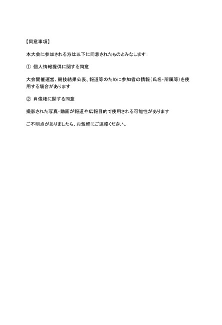 参加者は、運営・競技結果公表・報道等のために氏名/所属等が使用される場合があること、また撮影された写真・動画が広報目的で使用される可能性があることに同意したものとみなします。